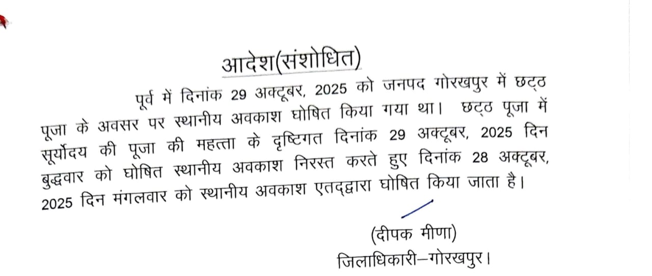 गोरखपुर। गोरखपुर में छठ महापर्व के अवसर पर घोषित स्थानीय अवकाश में संशोधन किया गया है। पूर्व में 29 अक्टूबर 2025 (बुधवार) को स्थानीय अवकाश घोषित किया गया था, जिसे अब प्रशासन द्वारा निरस्त कर दिया गया है।