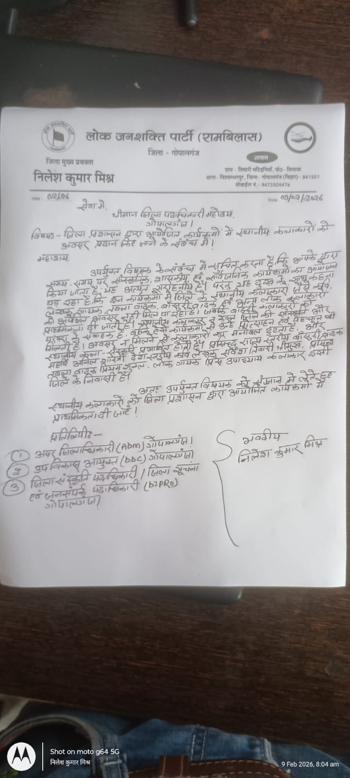 लोक जनशक्ति पार्टी रामविलास के जिला प्रवक्ता निलेश कुमार मिश्र ने जिला पदाधिकारी गोपालगंज को पत्र लिखकर जिला प्रशासन द्वारा आयोजित कार्यक्रमों में स्थानीय कलाकारों को जगह देने की बात कही है।। अपने पत्र में कहा है कि जिला प्रशासन द्वारा सांस्कृतिक शासकीय एवं सार्वजनिक कार्यक्रमों का आयोजन किया जाता है जो अत्यंत सराहनीय है।। परंतु यह दुख के साथ कहना पड़ रहा है कि ऐसे आयोजनों में स्थानीय कलाकारों को अपेक्षित अवसर नहीं मिल पा रहा है जबकि बाहरी कलाकारों को प्राथमिकता दी जा रही है।। स्थानीय कलाकार न केवल जिले के संस्कृति और परंपरा के संवाहक है बल्कि ऐसे कार्यक्रमों से उन्हें प्रोत्साहन एवं पहचान भी मिलती है।। जिला प्रवक्ता ने लिखा कि ऐसे कार्यक्रमों में अवसर न मिलने से कलाकारों का मनोबल टुटता है और स्थानीय कला-संस्कृति प्रभावित होती है।।पत्र के माध्यम से राज्य स्तरीय बांसुरी वादक महर्षि अनिल शास्त्री देश स्तरीय कवि लेखक सर्वेश तिवारी श्रीमुख प्रसिद्ध तबला वादक प्रियम शुक्ल लोक गायक प्रिंस उपाध्याय जैसे कलाकारों को जगह जिला प्रशासन द्वारा आयोजित कार्यक्रमों में दिया जाएं इसके लिए भी जिला पदाधिकारी को जानकारी दी गई है।।