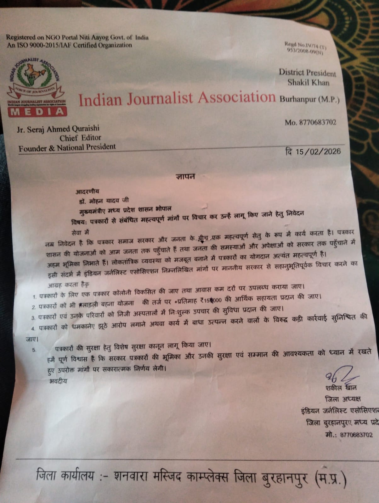इंडियन जर्नलिस्ट एसोसिएशन ने ज्ञापन के माध्यम से स्पष्ट किया कि पत्रकार शासन और जनता के बीच एक महत्वपूर्ण सेतु के रूप में कार्य करते हैं। लोकतांत्रिक व्यवस्था को मजबूत बनाने में उनकी भूमिका अहम है, इसलिए उनकी सामाजिक और आर्थिक सुरक्षा सुनिश्चित करना सरकार का दायित्व है। पत्रकारों के लिए एक समर्पित पत्रकार कॉलोनी विकसित की जाए और उन्हें कम दरों पर आवास उपलब्ध कराया जाए। लाडली बहना योजना’ की तर्ज पर पत्रकारों को भी हर महीने ₹15,000 की आर्थिक सहायता प्रदान की जाए पत्रकारों और उनके परिवारों को निजी अस्पतालों में निःशुल्क इलाज (कैशलेस उपचार) की सुविधा प्रदान की जाए।